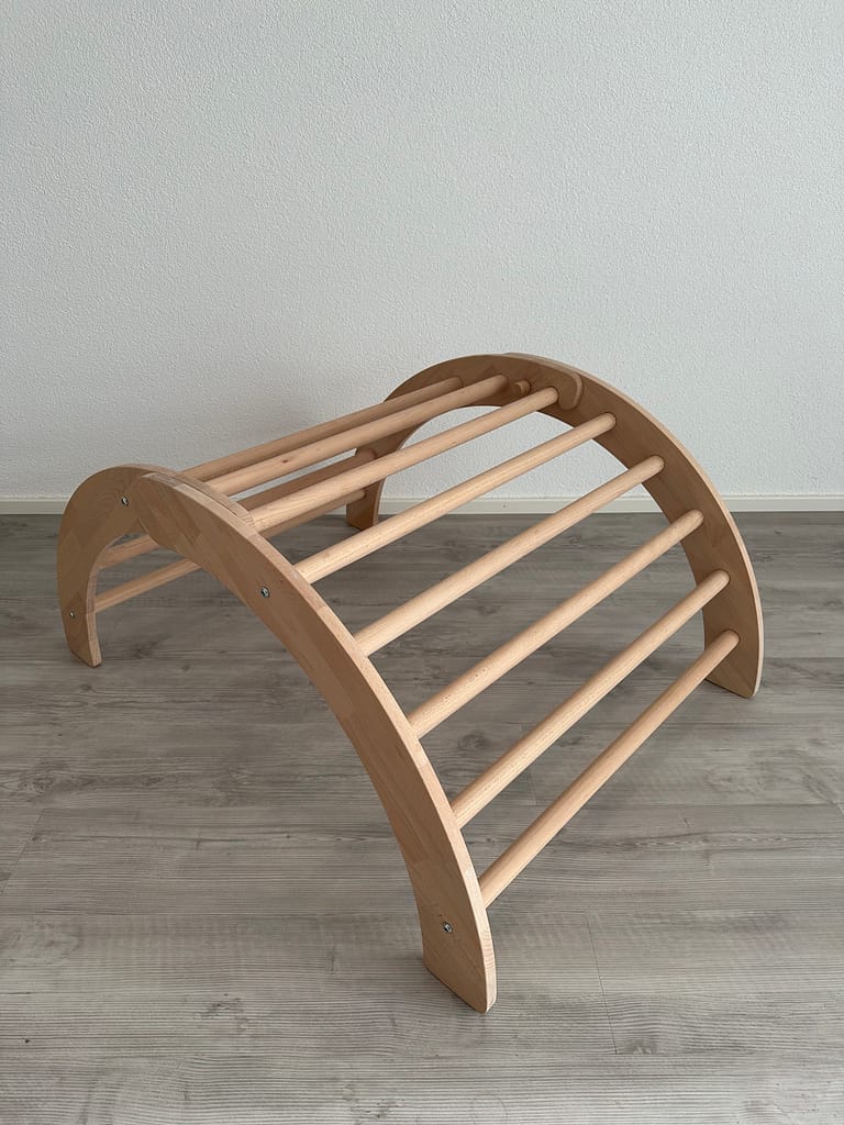 Der Kletterbogen ist ein wunderbares Bewegungsspielzeug für Drinnen. An windigen und regnerischen Tagen können sich die Kleinen in den eigenen vier Wänden am Kletterbogen austoben. Wie auch das Kletterdreieck fördert der Kletterbogen die natürliche motorische Entwicklung deines Kindes – und zwar im Tempo wie es für Dein Kind richtig ist. Die Kleinen können sich an dem Kletterbogen hochziehen und erleben so ihre ersten Steh-Versuche. Ältere Kinder lernen klettern und Stufen zu steigen, dadurch wird die Motorik und Bewegungssicherheit geschult. Auch als Tunnel oder zum Bauen einer kuscheligen Höhle kann er genutzt werden. Umgedreht und mit einer weichen Unterlage (z.B. Gartenstuhlpolster) wird der Kletterbogen zur gemütlichen Wippe. Mit einer integrierten Kindersicherung wird sichergestellt, dass der Kletterbogen nicht versehentlich zusammenklappt. Um Platz zu sparen und für den Transport kann er ganz einfach zusammengeklappt werden.